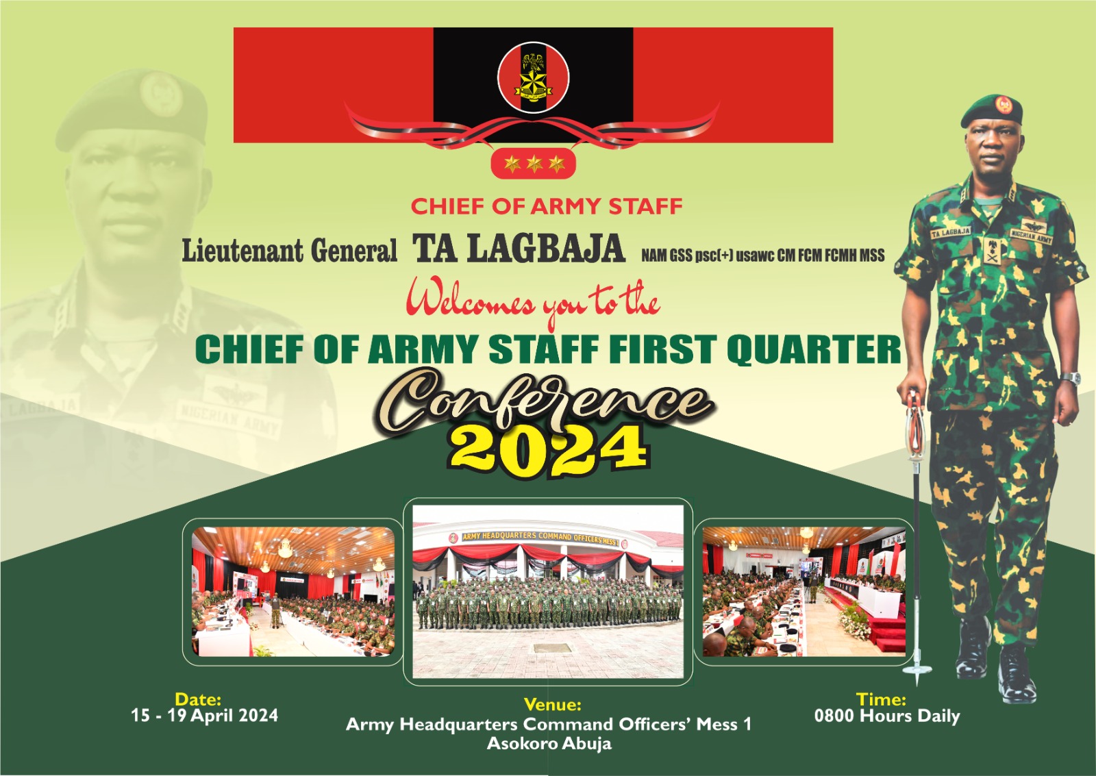 The Nigerian Army is set to hold its Chief of Army Staff First Quarter Conference 2024 at the Army Headquarters Command Officers’ Mess, Asokoro, Abuja from Monday 15 to Friday 19 April 2024.