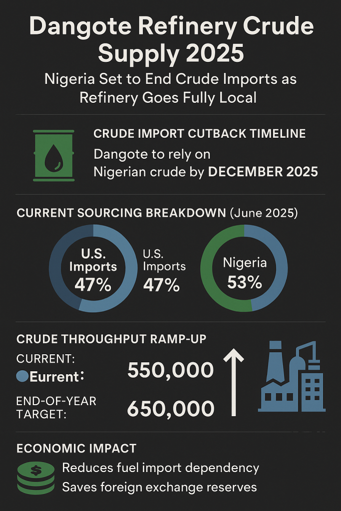 #DangoteRefinery, #NigeriaOil, #CrudeSupply2025, #RefineryUpdate, #LocalCrude #NNPC, #OilAndGasNigeria, #EnergySecurity, #DownstreamDevelopment, #MadeInNigeriaFuel,