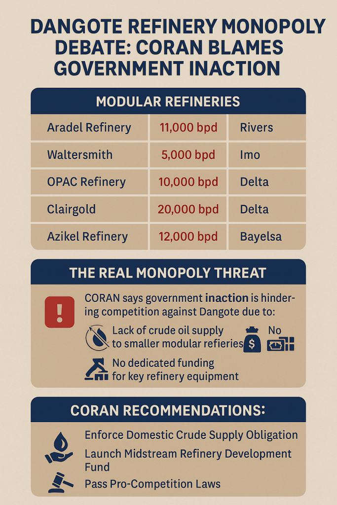 The Dangote Refinery monopoly debate heats up as CORAN argues government inaction, not Dangote, is threatening competition by starving modular refineries of crude oil and funding.