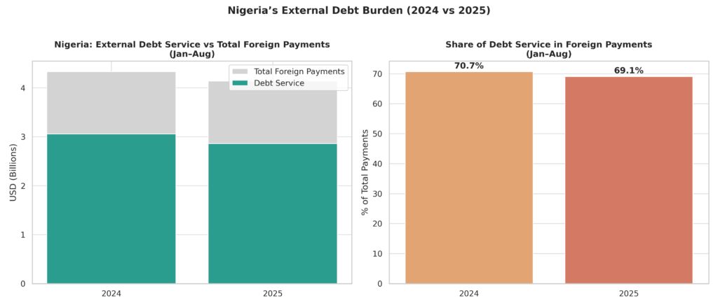 Nigeria spent $2.86 billion servicing external debt between January and August 2025, representing 69.1% of total foreign payments of $4.14 billion, according to new data released by the Central Bank of Nigeria (CBN) on Wednesday.