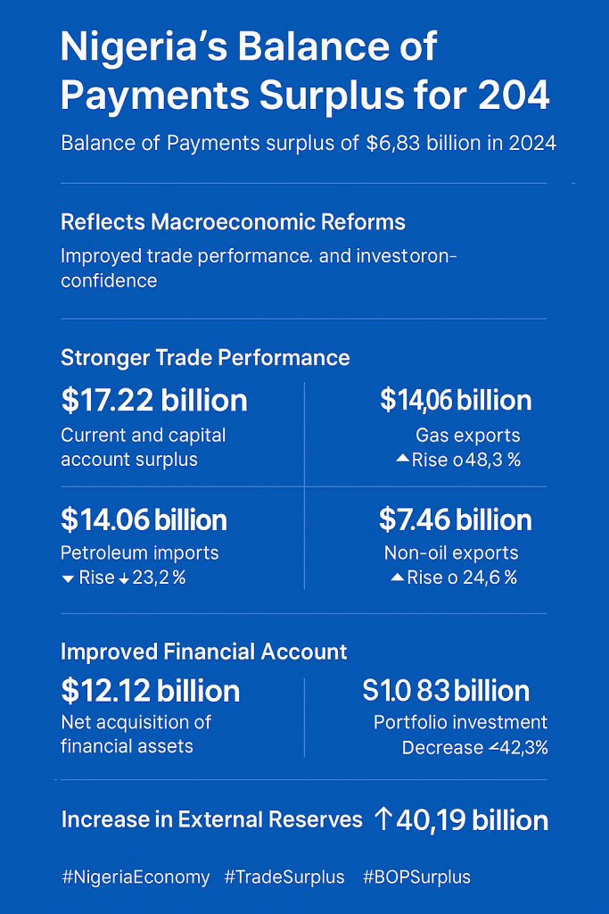 The $6.83 billion Balance of Payments surplus in 2024 reflects a positive shift in Nigeria’s external economic health and positions the country for stronger macroeconomic performance going forward. The CBN’s data offers hope that the era of persistent deficits could be coming to an end, thanks to improved trade performance, increased diaspora engagement, and prudent financial management.