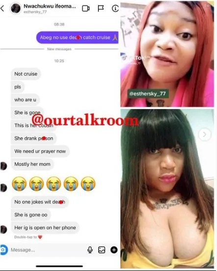 A chat shared by an Instagram blog, Ourtalkroom with her cousin who accessed the deceased Instagram account confirmed that the beautiful actress drank poison.