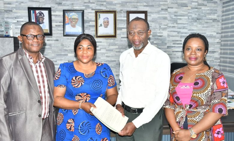 Caption: From right: Rector, Yaba College of Technology, Dr. Engr. Ibraheem Abdul presenting letter of N34m TETFund NRF Award to the principal investigator, Mrs. Oluwatosin Amolegbe, a lecturer in Biological Department, Yabatech and flanked by Dr. Funmilayo Doherty (left), Director, Centre for Research Support and Grant Management and Dean, School of Science, Dr. Waidi Abiodun Ashiru