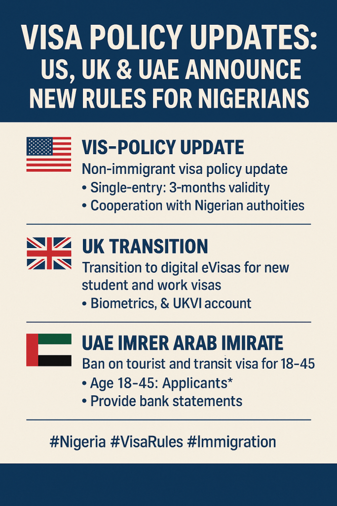 #VisaRestrictionsForNigerians, #USVisaUpdate, #UKeVisaNigeria, #UAEVisaBan, #ImmigrationNews, #TravelAdvisoryNigeria, #DigitalVisas, #NigeriansAbroad, #StudyAbroadNigeria, #VisaPolicyUpdate,