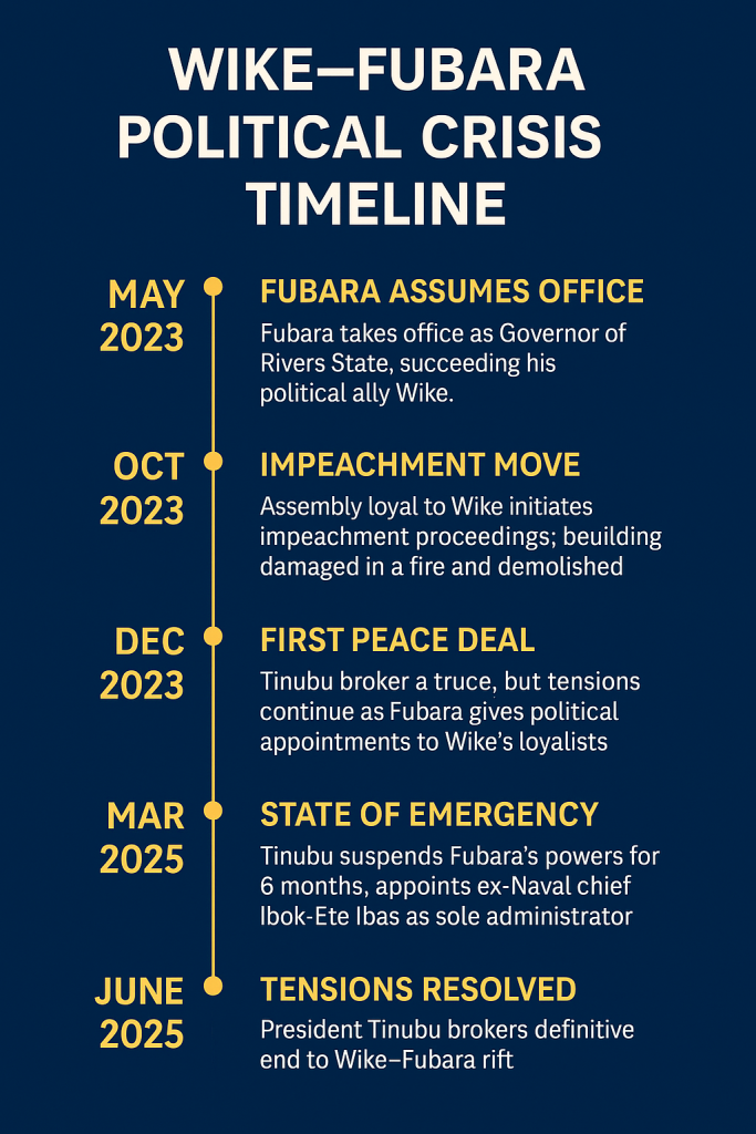 | Dec 2023 | Tinubu brokers initial truce; Fubara cedes political appointments |
