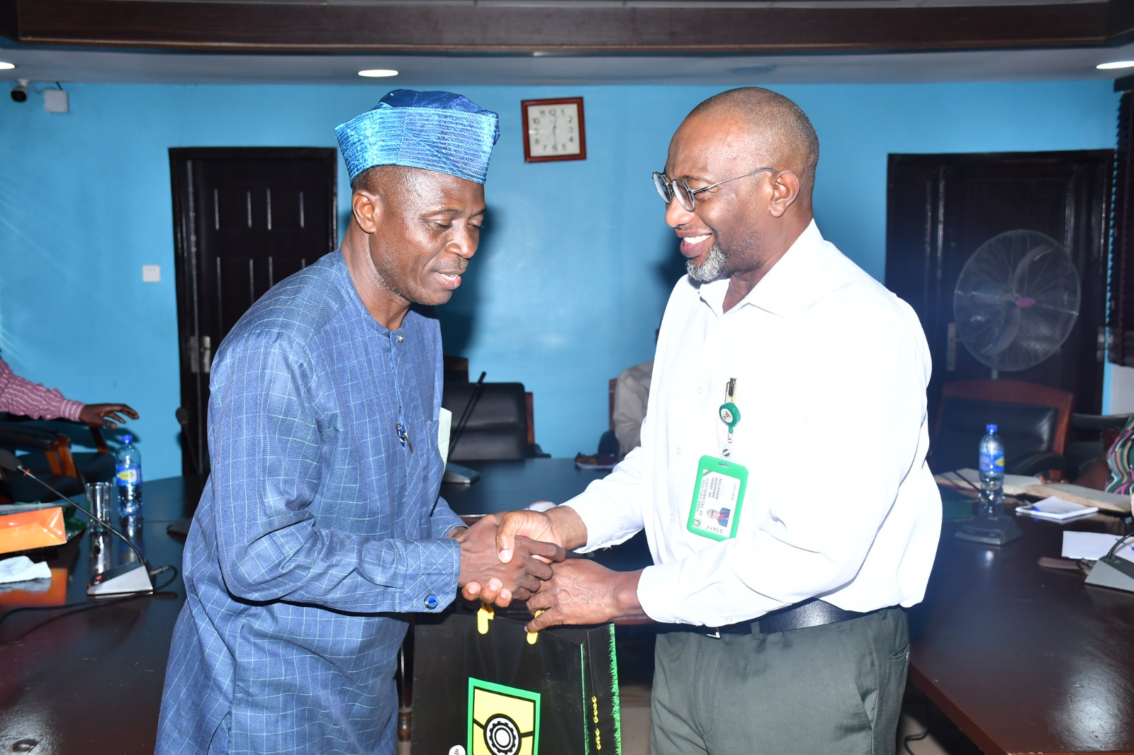 Caption: Engr Bello Adekunle, Chairman, Nigeria Society of Nigeria, Lagos State Branch (l) receiving souvenir from the Rector, Yaba College of Technology, Engr Abdul Ibraheem during the courtesy visit paid by the Society