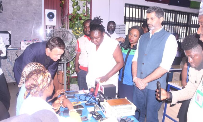 Photo caption: Cross view of the delegation from Unicef and Generation Unlimited led by its Chief Executive Officer , Kevin Grey (bent in the middle) with officials of Yabatech in the midst of Yabatech’s GESP beneficiaries in display of their acquired skills to the delegation on laptop and phones repair during an on the spot assessment of the Project in the college.